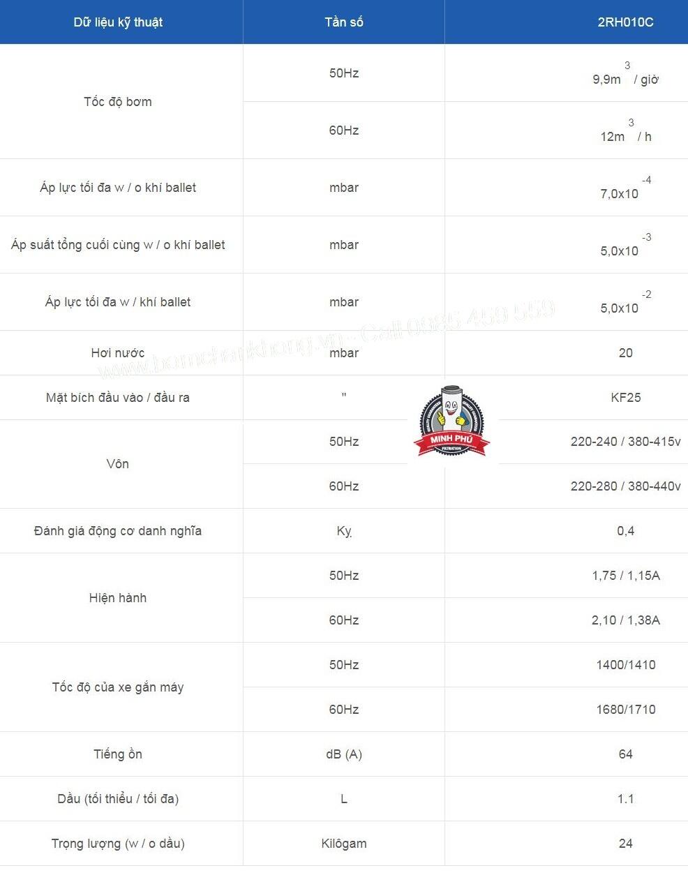 Dữ liệu kỹ thuật Bơm chân không 2RH010C