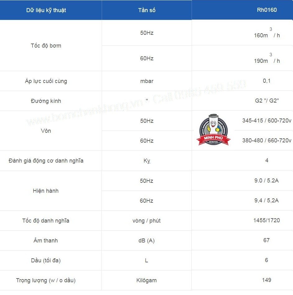 Dữ Liệu Kỹ Thuật Bơm chân không HOKAIDO RH0160