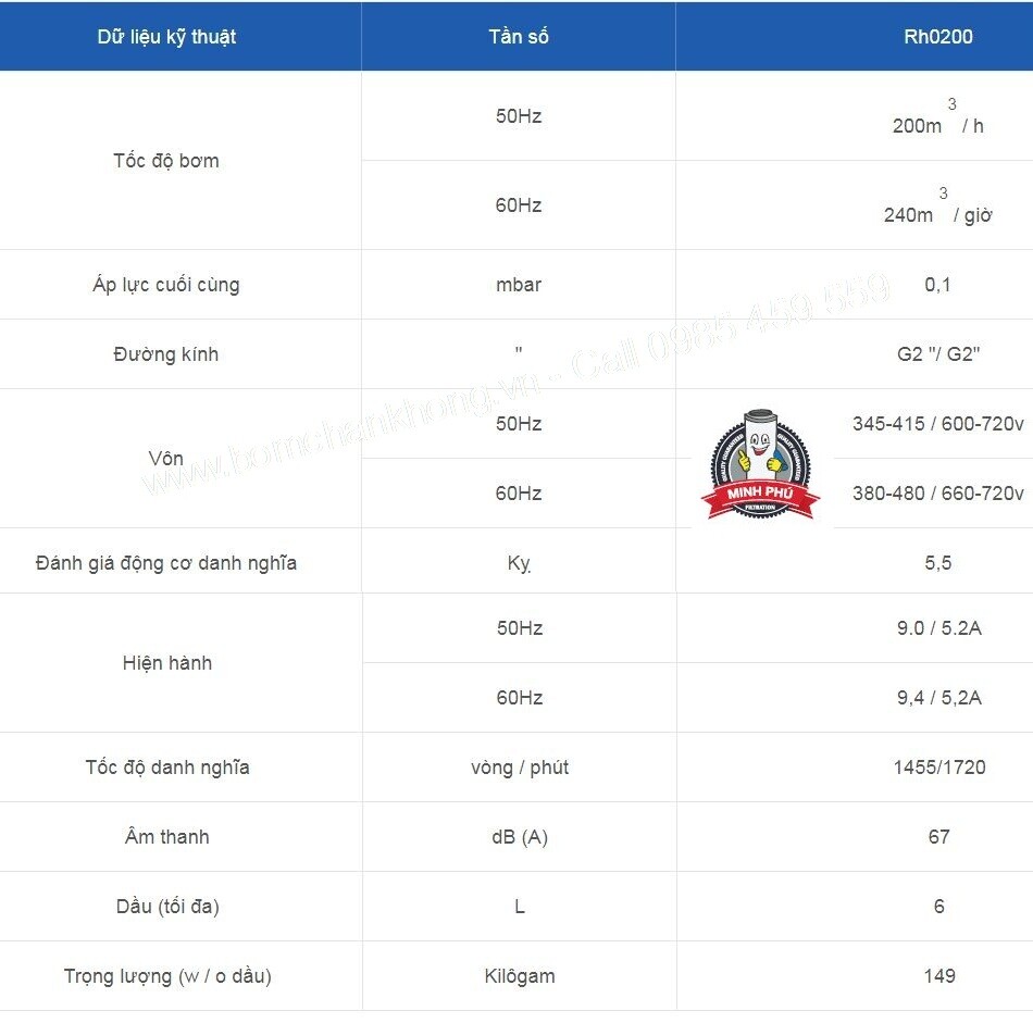 Dữ Liệu Kỹ Thuật Bơm chân không HOKAIDO RH0200