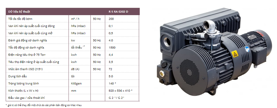 RA 0202 D dùng 05 lít dầu VM100 hoặc dầu chuyên cho bơm chân không có độ nhớt 100 như Plus530 ( PrecisionPlus - USA )